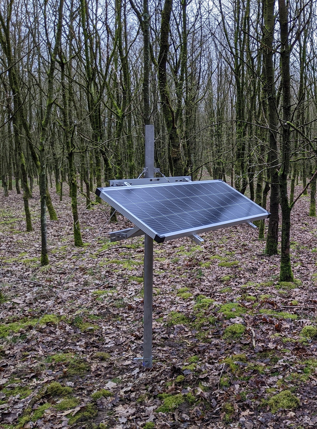 The sensors are mounted on vertical stainless steel poles, stabilised with support cables to ensure structural integrity under field conditions. Each system operates off-grid using nearby solar panels, with power lines housed in protective tubing to guard against environmental exposure and interference from wildlife.